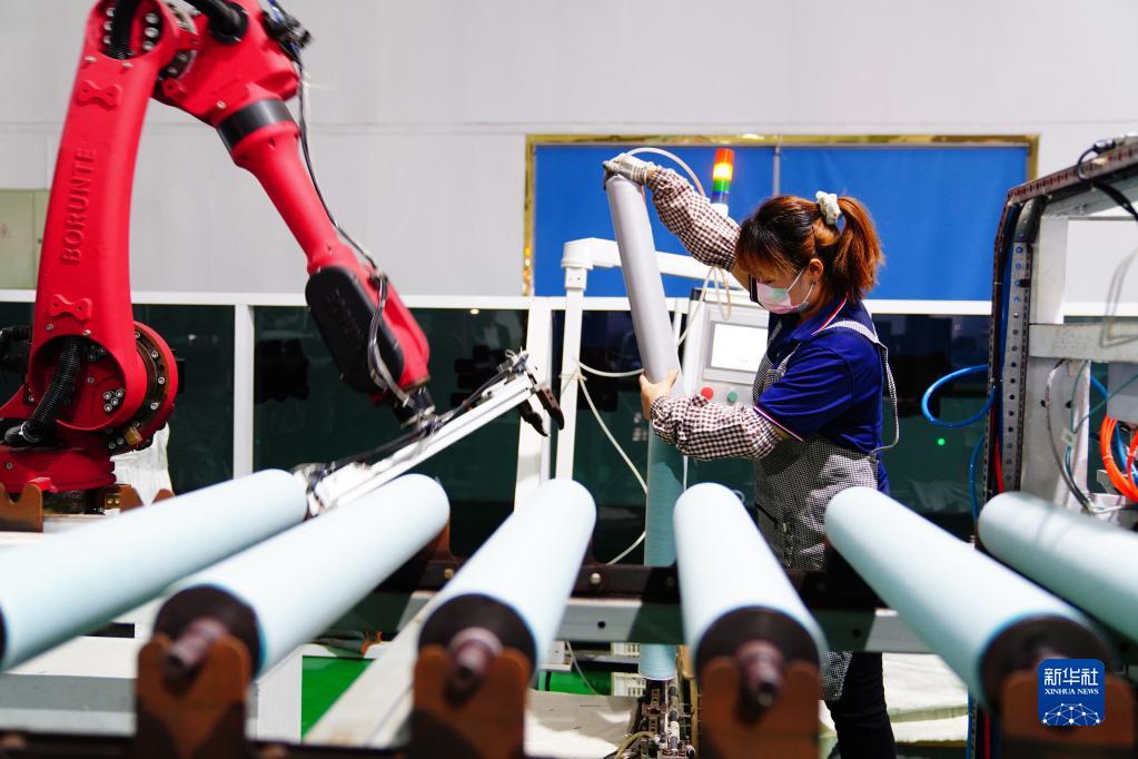 9月25日,在惠民縣德潤杰(山東)紡織科技有限公司,工作人員在生產(chǎn)膠輥膠圈。