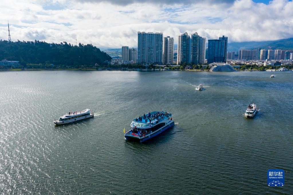 9月26日,新能源游船“風(fēng)花雪月號”在洱海行駛(無(wú)人機照片)。