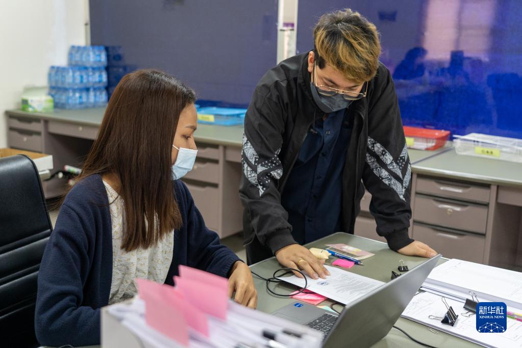 9月7日,在泰國呵叻,中泰鐵路項目部監理總站專(zhuān)職翻譯南塔蓬(右)與同事討論工作。