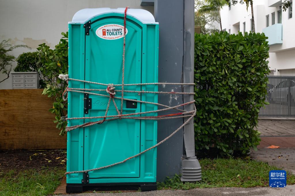 9月27日,在美國佛羅里達州邁阿密,一處移動(dòng)廁所被固定到柱子上,防備即將到來(lái)的颶風(fēng)。