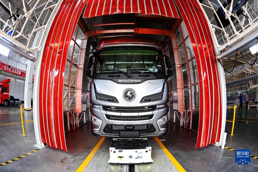 一輛重卡在陜汽重卡擴能項目汽車(chē)總裝生產(chǎn)線(xiàn)進(jìn)行下線(xiàn)檢測(9月27日攝)。