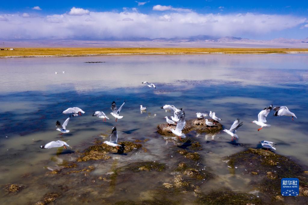 9月27日,紅嘴鷗在小蘇干湖上飛舞(無(wú)人機照片)。
