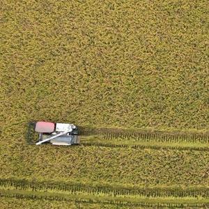 9月28日,合肥市肥西縣花崗鎮河豐社區村民駕駛收割機收獲中稻(無(wú)人機照片)。