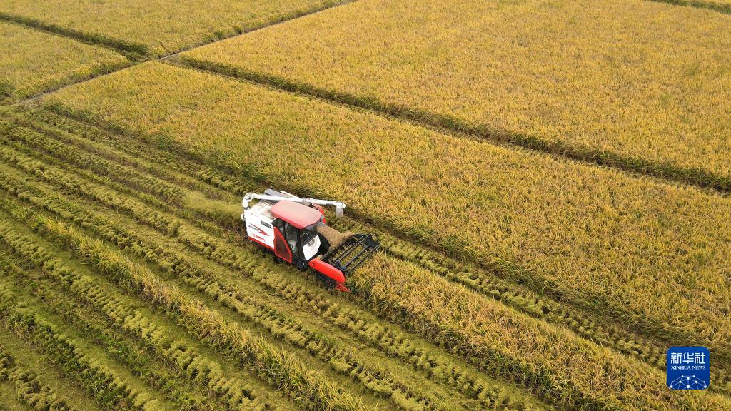 金秋時(shí)節,安徽省合肥市肥西縣花崗鎮河豐社區中稻陸續成熟,當地農民搶抓晴好天氣收割水稻,田間地頭一派豐收景象。
