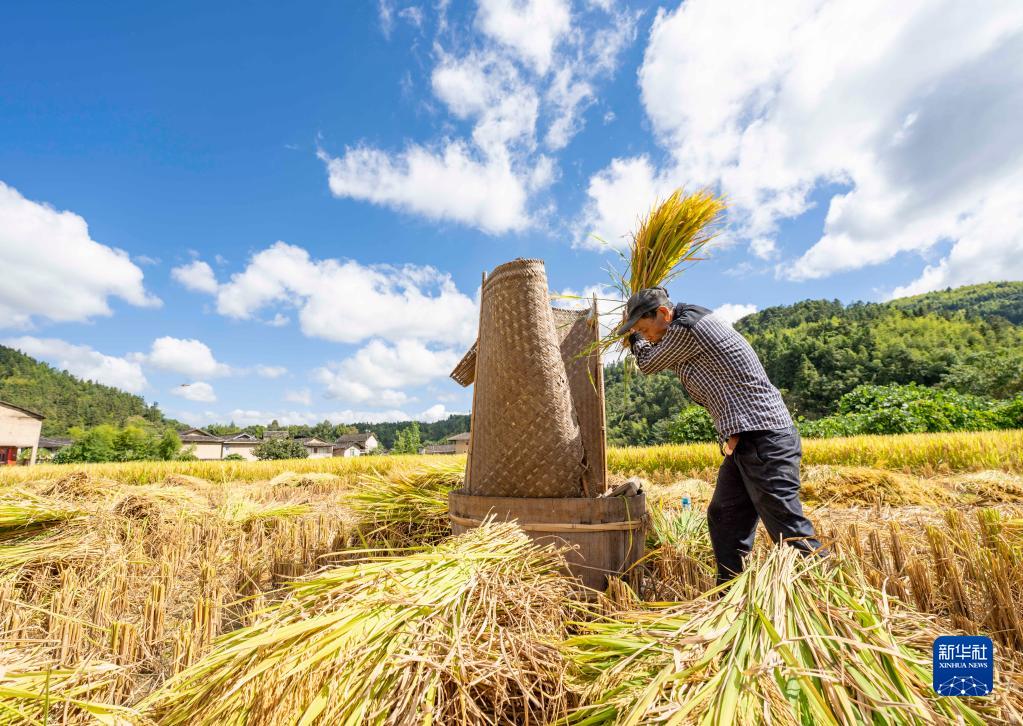 9月28日,福建省漳州市南靖縣書(shū)洋鎮曲江村村民在田間打稻谷。