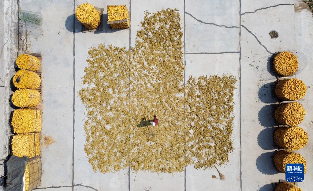 9月28日,河北省石家莊市井陘縣小作鎮胡雷村農民在晾曬谷子和玉米。