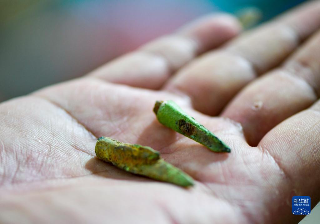 9月27日,考古發(fā)掘隊隊員程濤在臨時(shí)庫房?jì)日故境鐾恋你~制箭鏃。