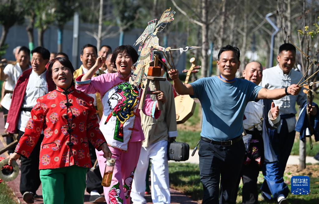 西北綜勘黃河老腔藝術(shù)團藝人在潼關(guān)縣明德公園表演后,慶祝演出成功(9月26日攝)。
