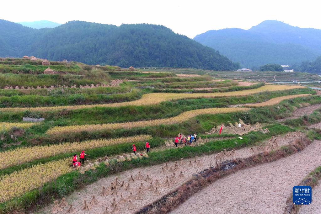 9月29日,貴州省龍里縣灣灘河鎮黨員志愿者在稻田里幫助農戶(hù)收割水稻(無(wú)人機照片)。