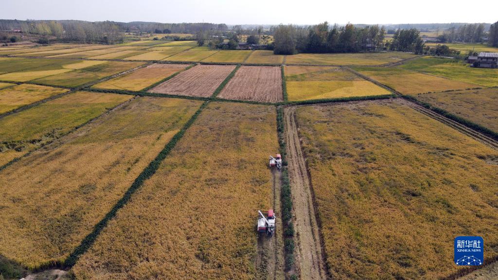 9月29日,安徽省合肥市肥東縣古城鎮農民駕駛收割機收獲水稻(無(wú)人機照片)。