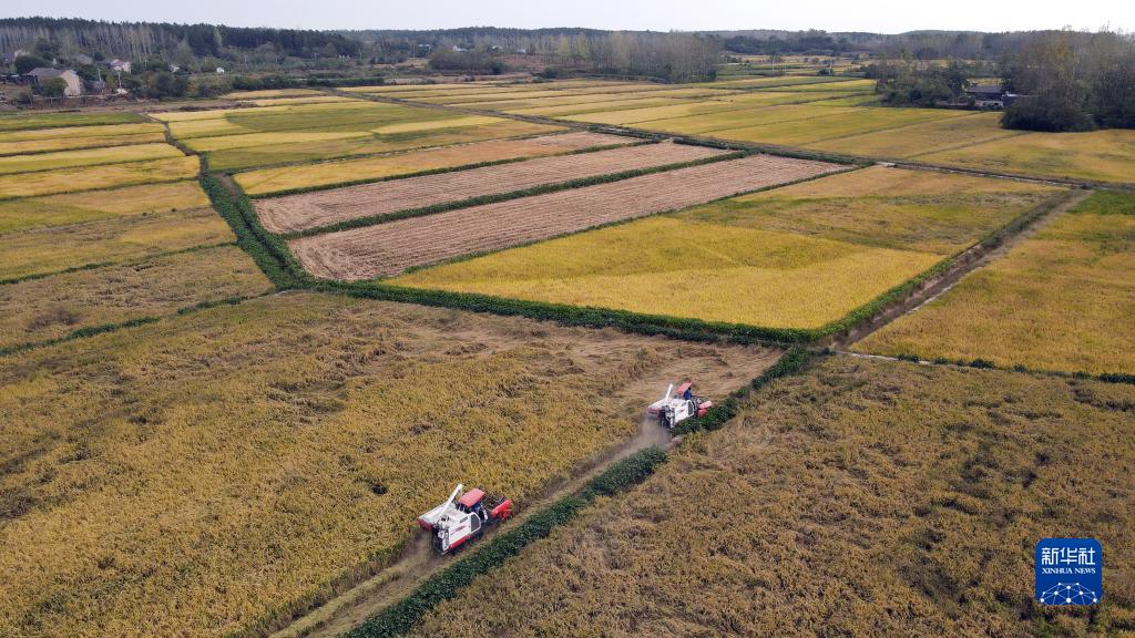 9月29日,安徽省合肥市肥東縣古城鎮農民駕駛收割機收獲水稻(無(wú)人機照片)。