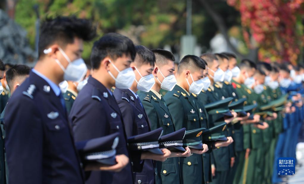 9月30日,在沈陽(yáng)抗美援朝烈士陵園紀念碑廣場(chǎng),參加烈士紀念日活動(dòng)的人們默哀。