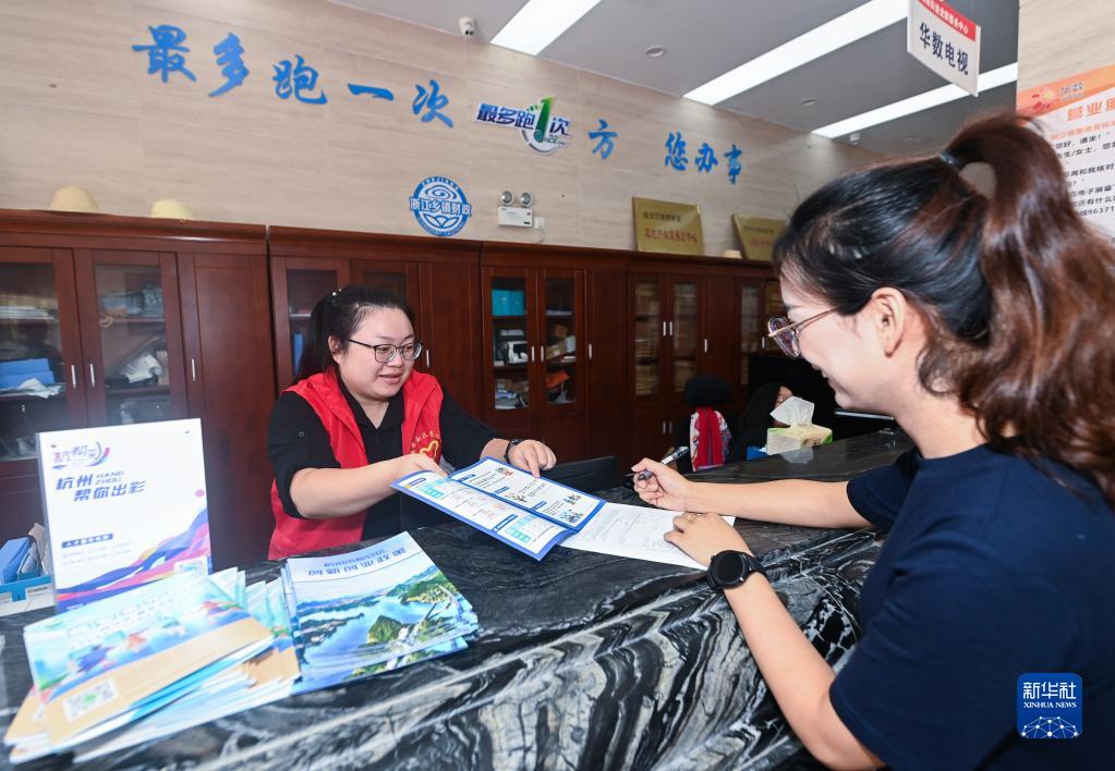 9月30日,在杭州市臨安區錦南街道便民服務(wù)中心,工作人員(左)給企業(yè)員工解釋最新的人才政策并讓她填寫(xiě)相關(guān)表格。