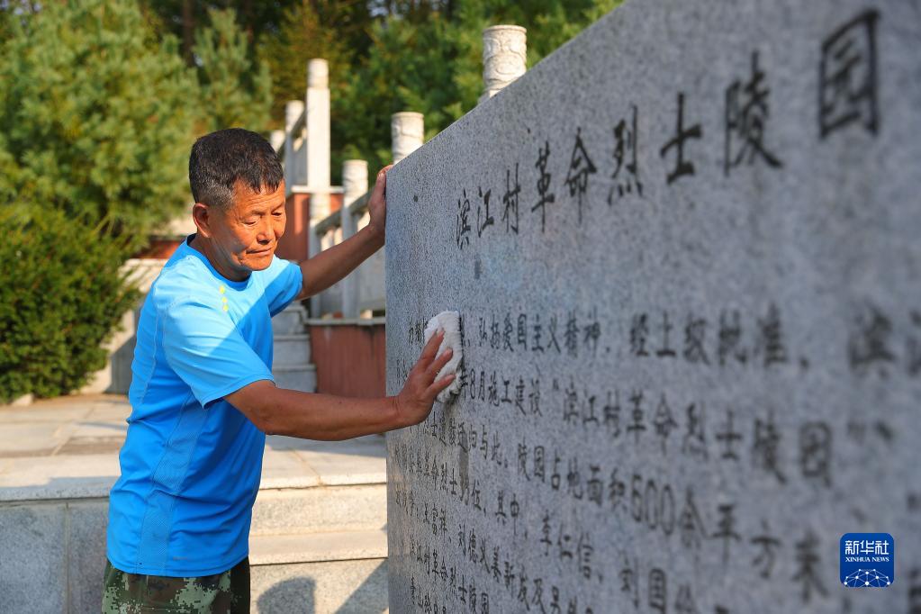 9月26日,村民擦拭濱江村革命烈士陵園石碑。
