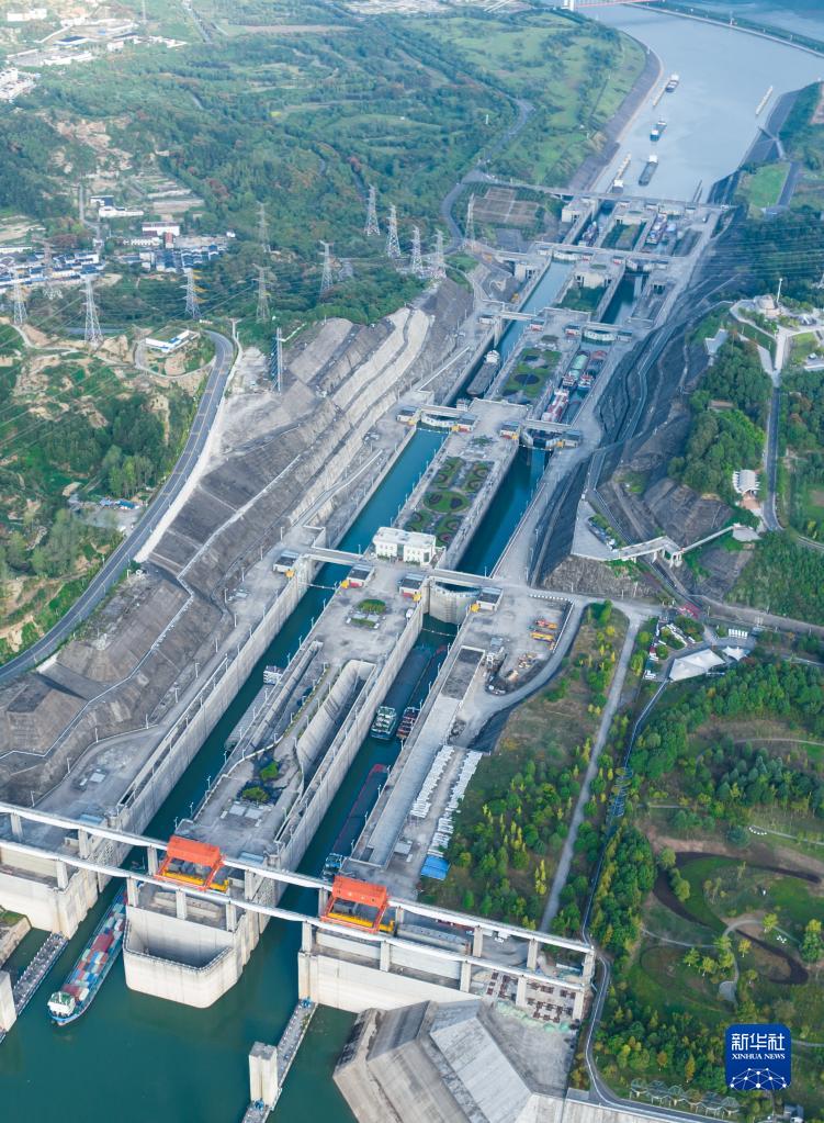 2022年9月29日,船舶有序通過(guò)三峽雙線(xiàn)五級船閘(無(wú)人機照片)。