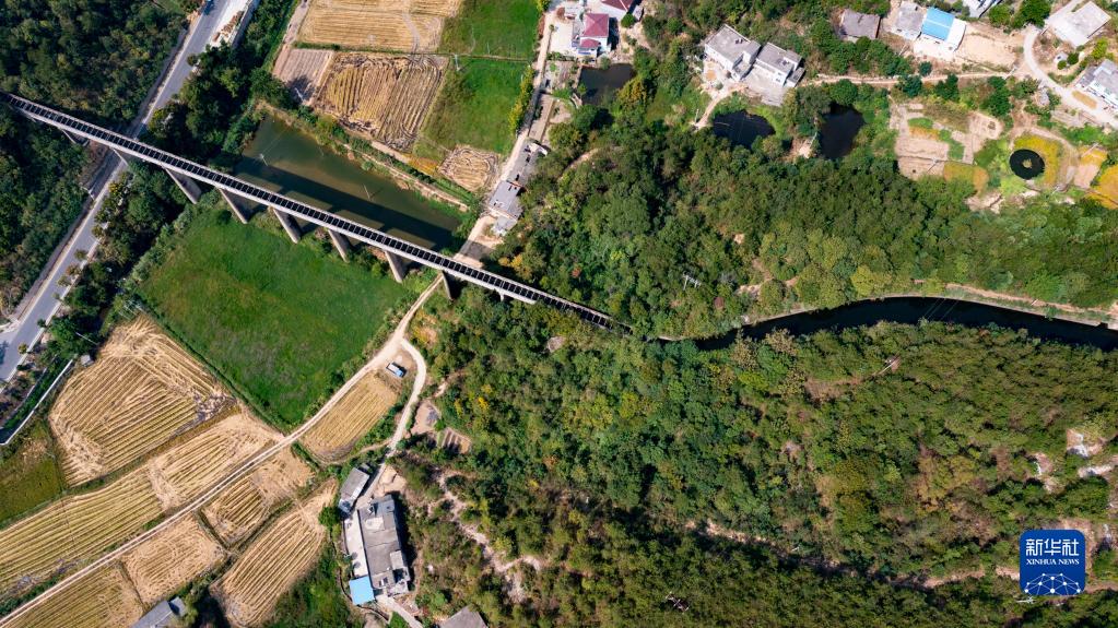 湖北白蓮河水庫的庫水經(jīng)東干渠流向黃岡市浠水縣和蘄春縣(無(wú)人機照片,2022年9月27日攝)。