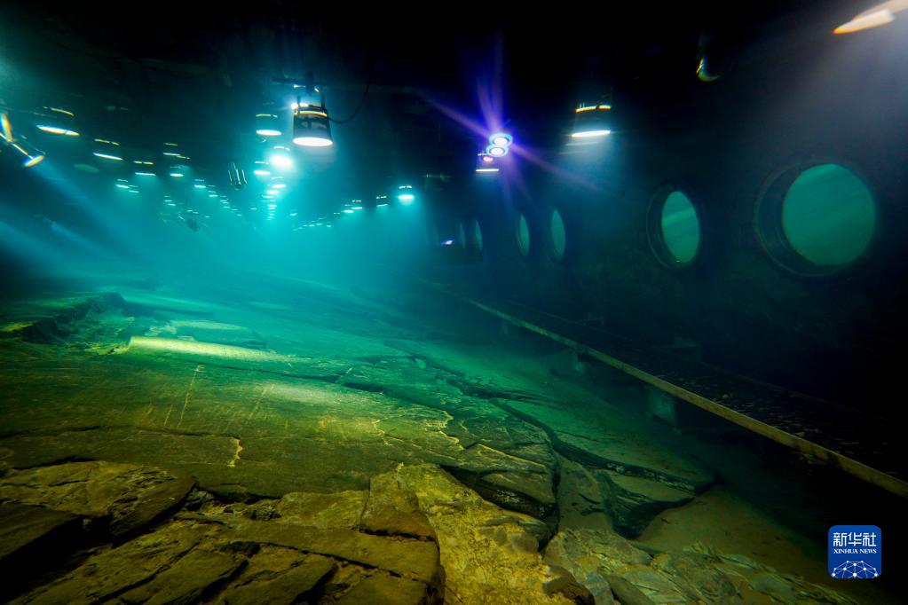 這是重慶白鶴梁水下博物館內利用“無(wú)壓容器”原理原址原貌原環(huán)境保護的白鶴梁題刻(2021年2月21日攝)。