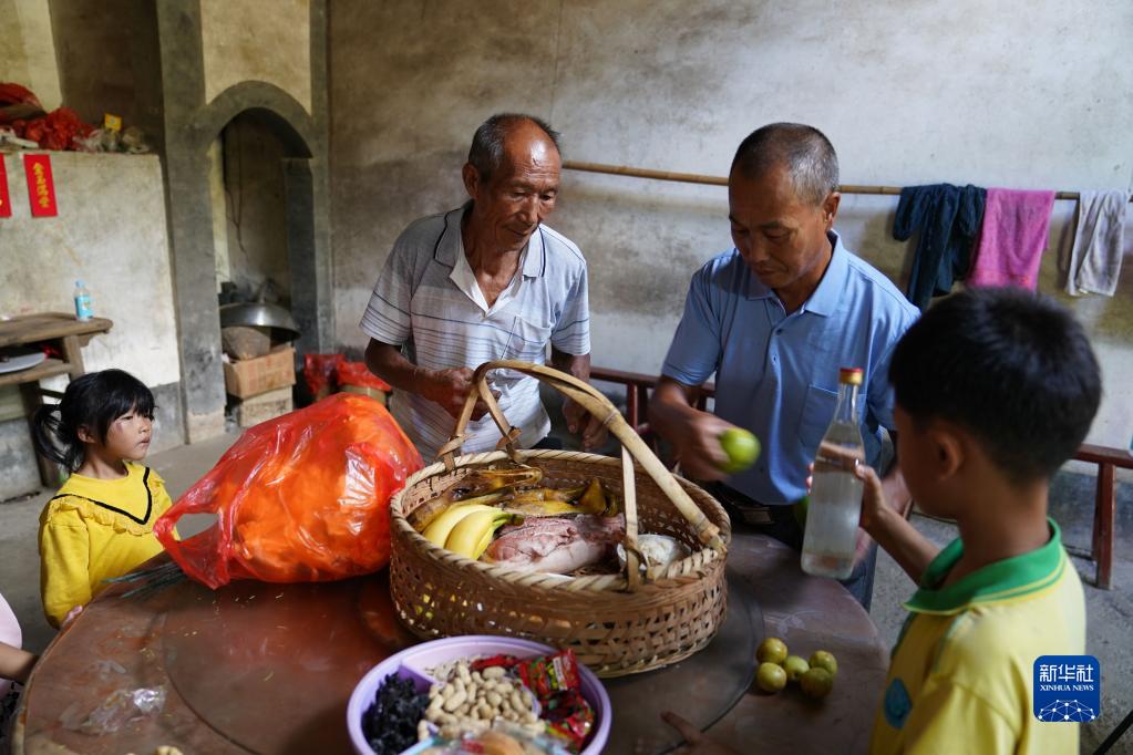 9月15日,謝南京(左二)與弟弟謝稱(chēng)發(fā)(右二)帶著(zhù)孩子們一起收拾物品準備前去祭掃。