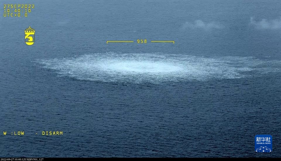 這張瑞典海岸警衛隊9月27日發(fā)布的航拍照片顯示的是一處“北溪”天然氣管道泄漏點(diǎn)。
