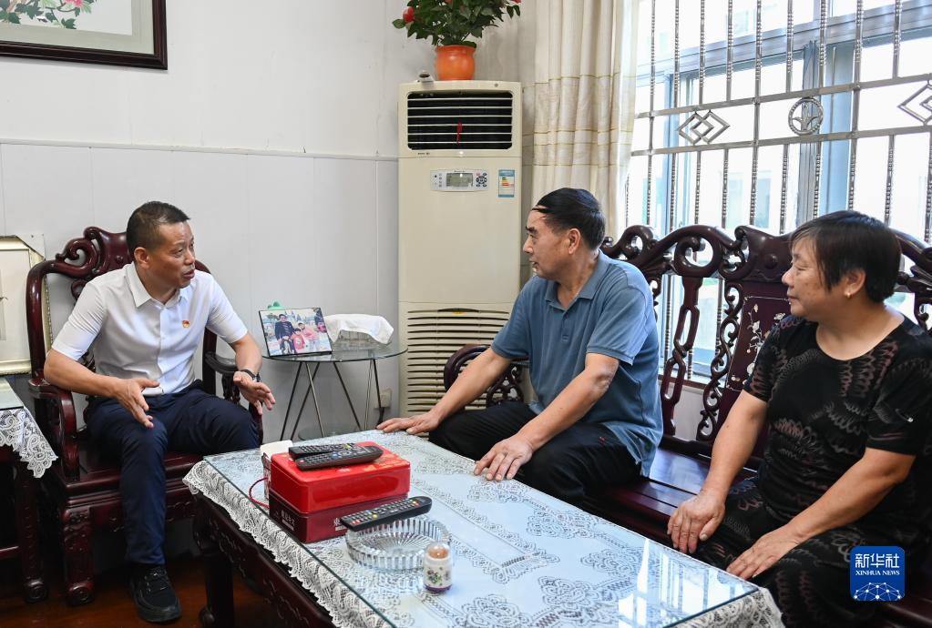 在浙江省寧波市奉化區蕭王廟街道滕頭村,傅平均(左)入戶(hù)走訪(fǎng)村民,聽(tīng)取意見(jiàn)和建議(9月16日攝)。