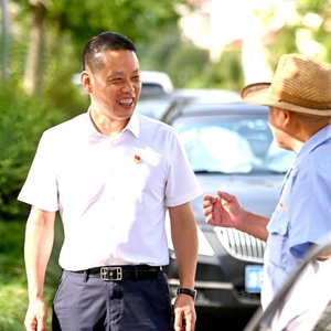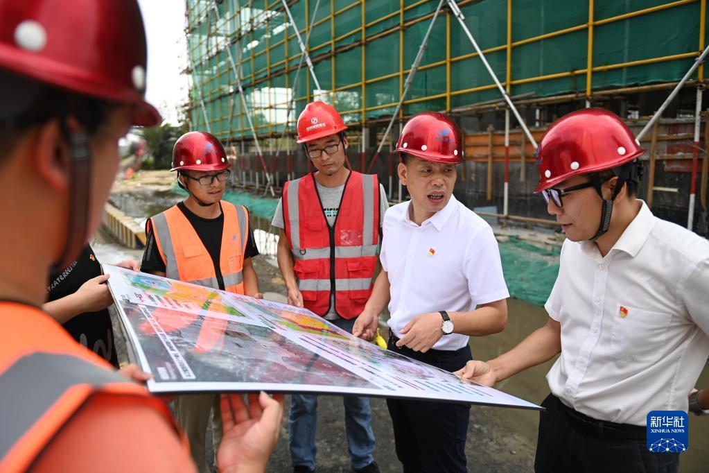在浙江省寧波市奉化區蕭王廟街道滕頭村,傅平均(右二)在村黨群服務(wù)中心大樓建設工地察看施工進(jìn)展(9月16日攝)。
