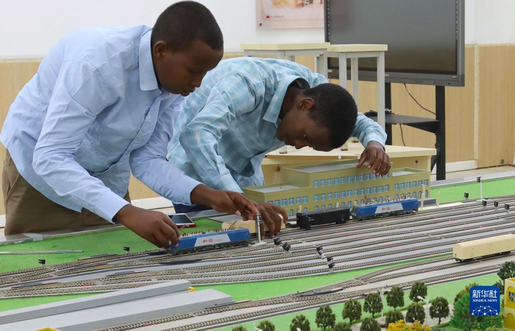 9月19日,在位于吉布提首都吉布提市的吉布提工商學(xué)校,學(xué)生在魯班工坊鐵道運營(yíng)沙盤(pán)教學(xué)區學(xué)習。