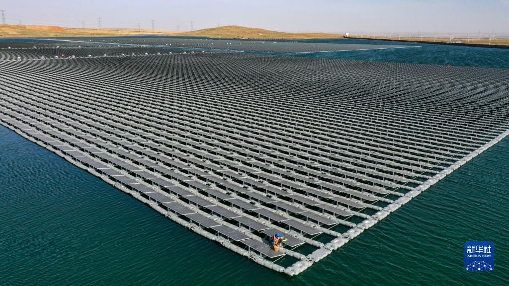 這是位于寧夏靈武市的國家能源集團寧夏電力公司寧東電廠(chǎng)3×5.98兆瓦漂浮分布式光伏發(fā)電項目(6月17日攝,無(wú)人機照片)。
