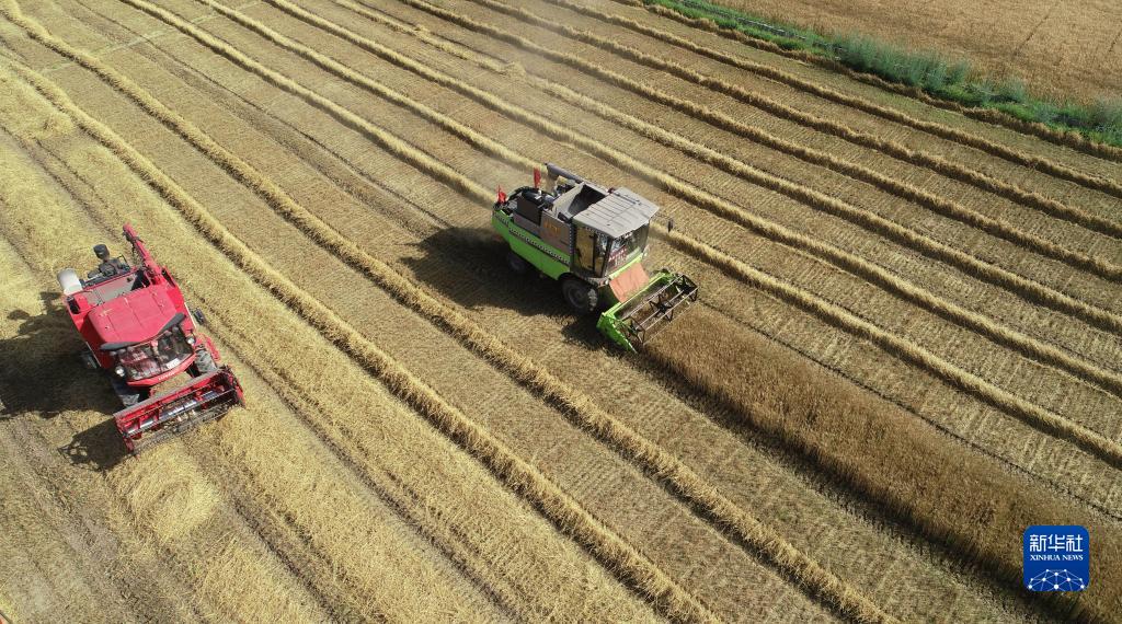 7月7日,在寧夏石嘴山市平羅縣姚伏鎮小店子村,聯(lián)合收割機在麥田里作業(yè)(無(wú)人機照片)。