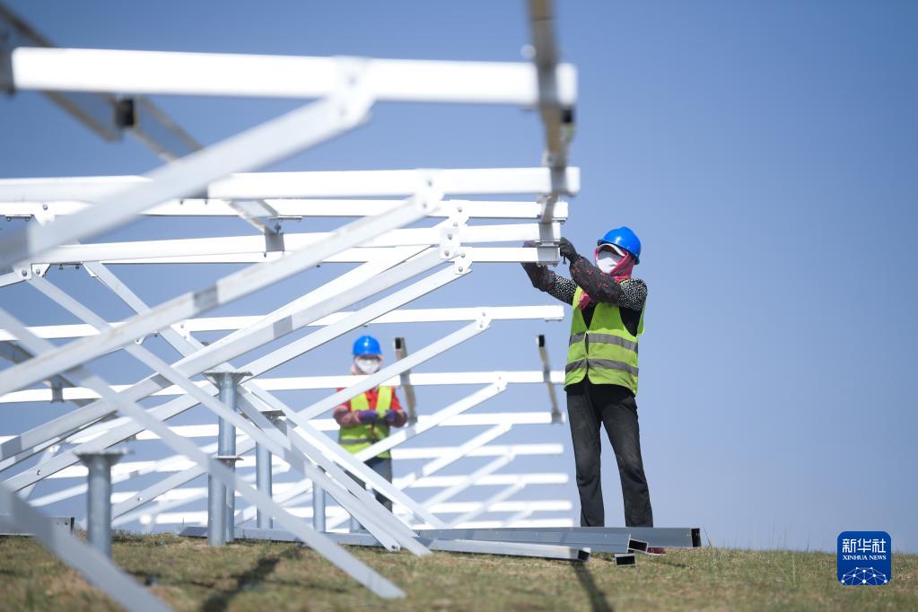 6月8日,在青海省海南藏族自治州共和縣,工人在黃河上游水電開(kāi)發(fā)有限責任公司海南基地共和縣100萬(wàn)千瓦光伏項目施工。