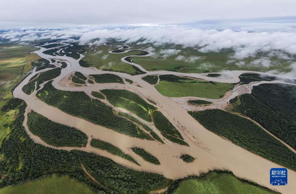 俯瞰位于四川省若爾蓋縣唐克鎮的白河牧場(chǎng)的黃河出川口(2022年8月16日攝,無(wú)人機照片)。