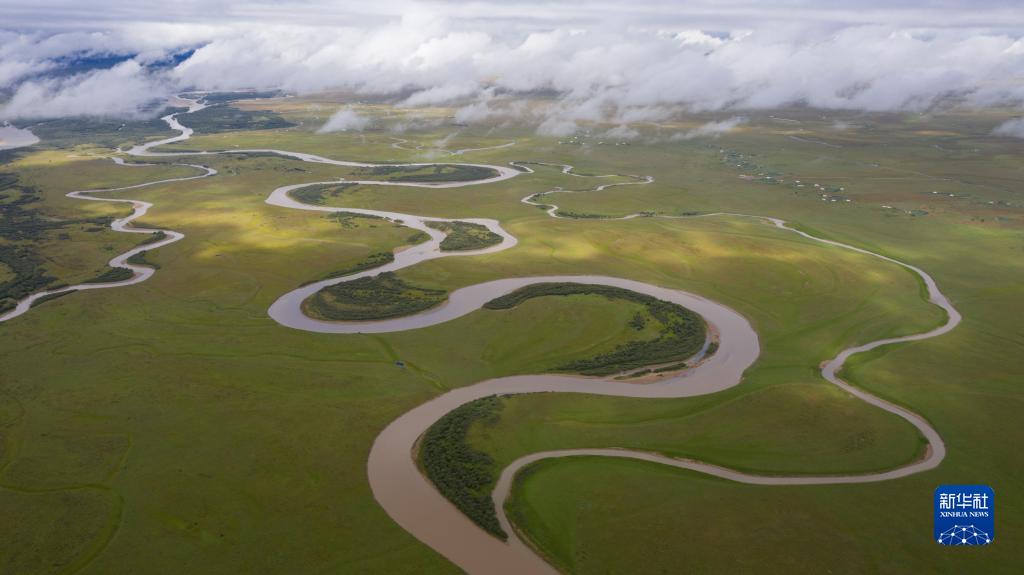 俯瞰位于四川省若爾蓋縣唐克鎮的白河牧場(chǎng)的黃河出川口(2022年8月16日攝,無(wú)人機照片)。