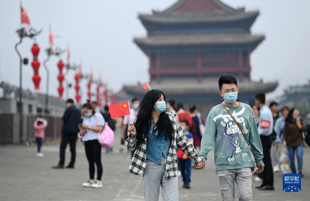 10月1日,在陜西省西安市,游客手持國旗在西安城墻景區參觀(guān)游覽。