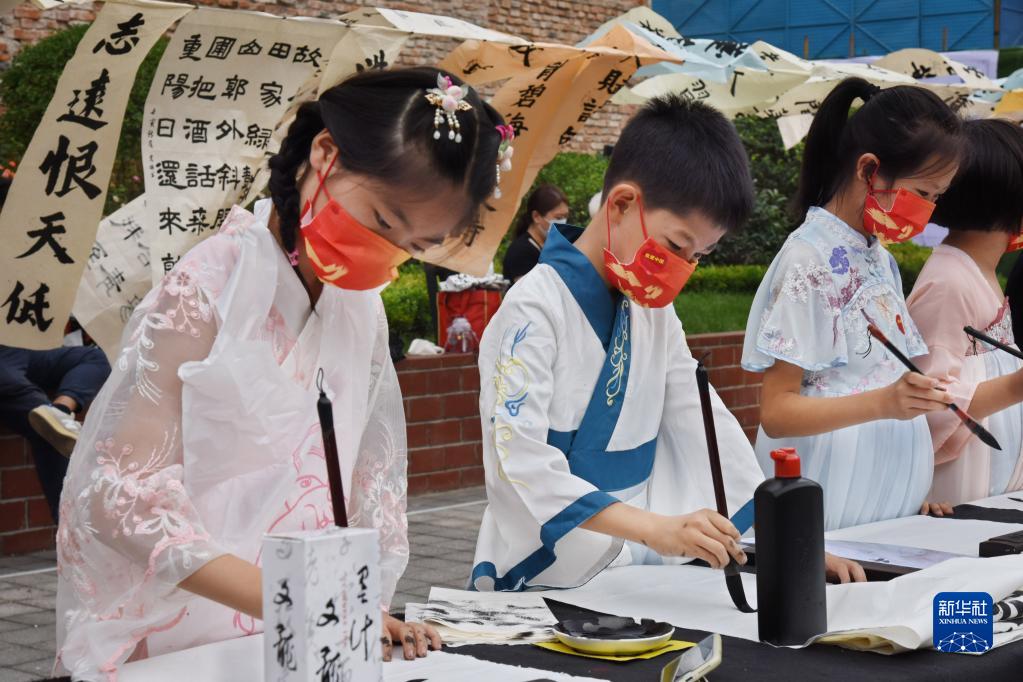 10月1日,孩子們在山東省青島市參加青少年傳統書(shū)法文化展演活動(dòng)。