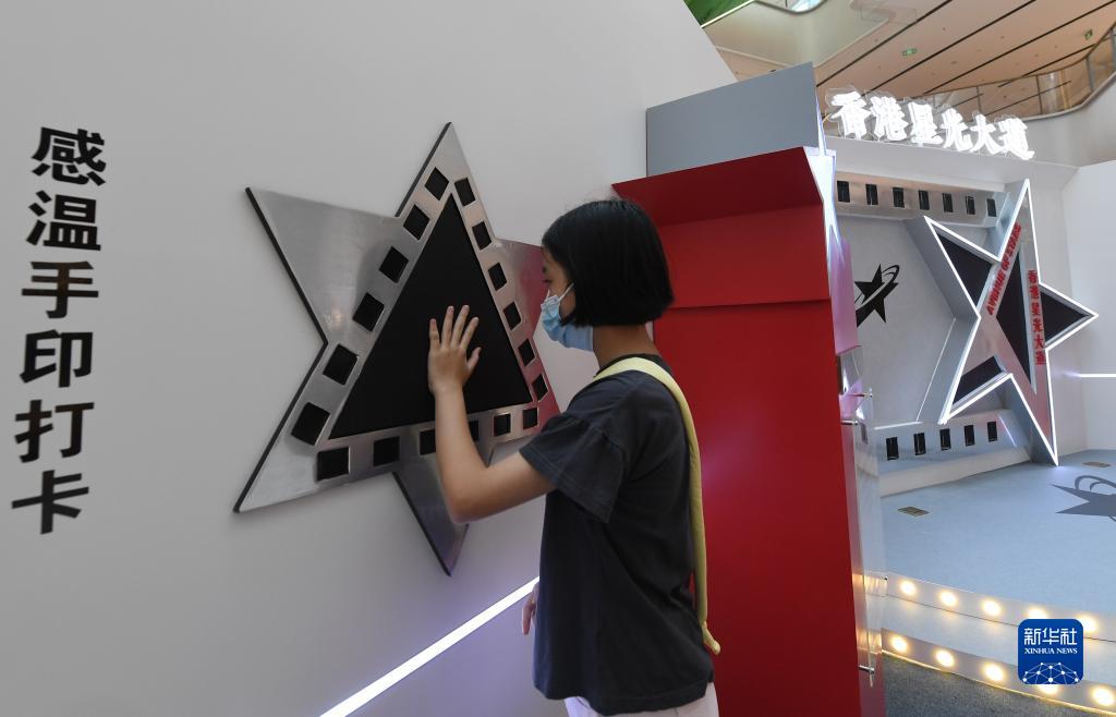 10月1日,市民在“再遇@香港”展覽上體驗星光大道場(chǎng)景下的感溫手印打卡互動(dòng)游戲。