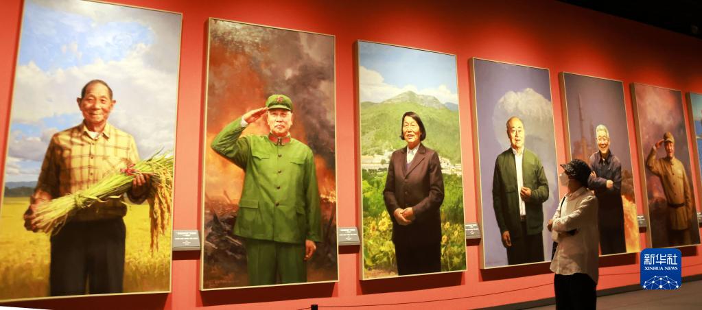 10月1日,觀(guān)眾在“筑夢(mèng)——我們的新時(shí)代美術(shù)攝影作品展”上觀(guān)看油畫(huà)《“共和國勛章”獲得者》。新華社記者 潘旭 攝