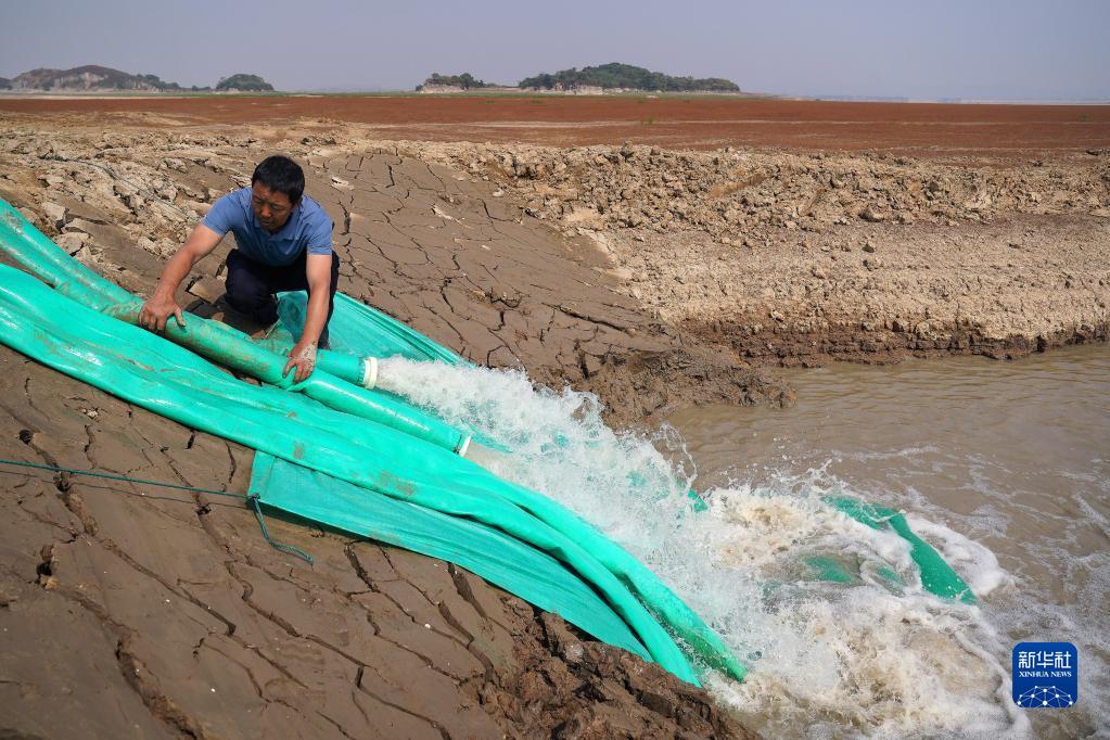 在江西省都昌縣,都昌縣候鳥(niǎo)自然保護區的工作人員用水泵將鄱陽(yáng)湖主航道的水抽至人工水渠,然后輸入至碟形湖中(9月28日攝)。