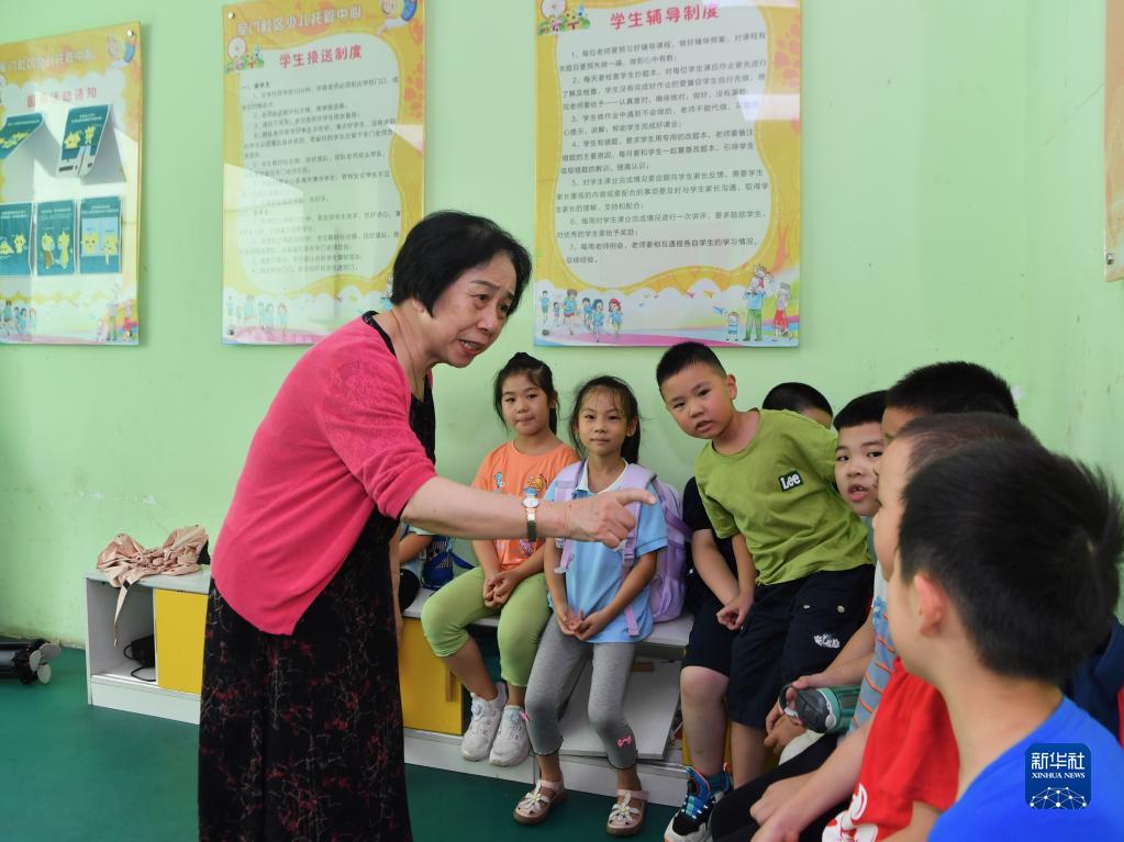 在福建省福州市軍門(mén)社區少兒托管中心,林丹與放學(xué)歸來(lái)的孩子們交流(2022年9月14日攝)。