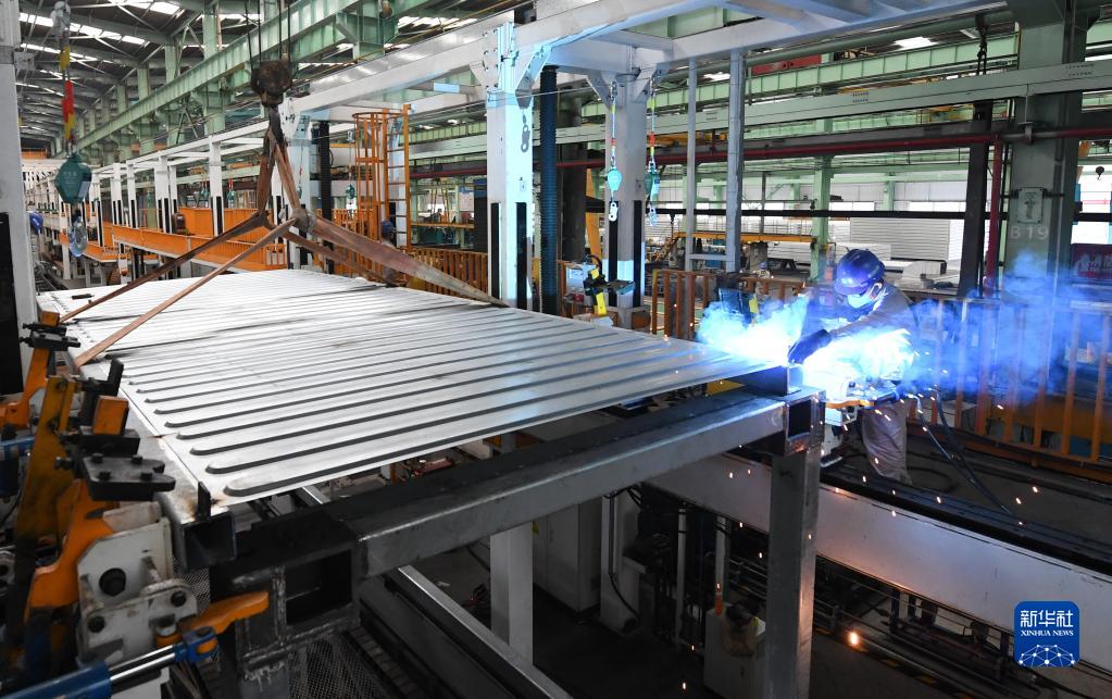 工人在智能化鋼結構模塊化生產(chǎn)線(xiàn)的總裝線(xiàn)上進(jìn)行焊接作業(yè)(2022年9月28日攝)。
