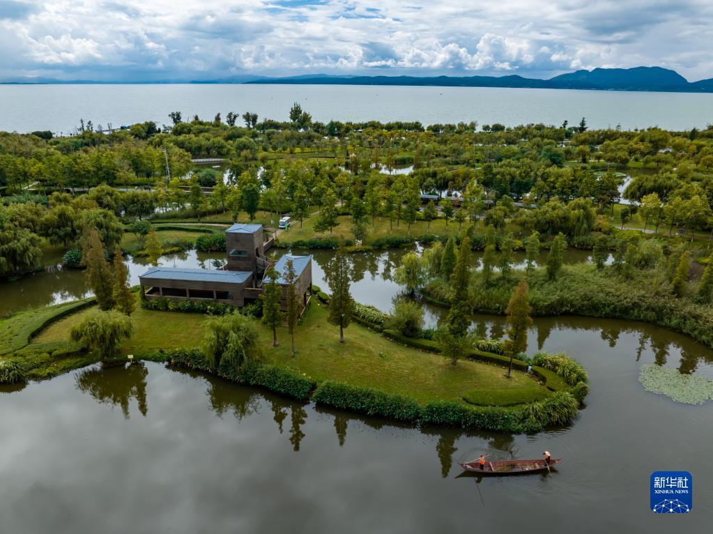 10月2日,滇池斗南濕地公園的工作人員畢少華(左)與張明華在濕地公園清理河道(無(wú)人機照片)。