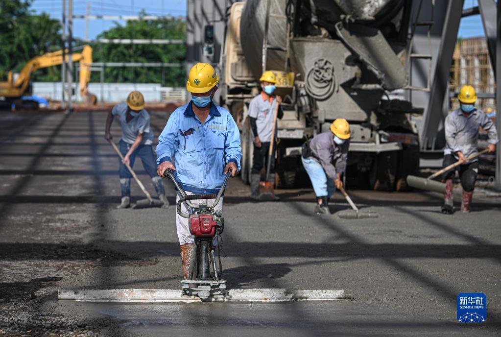 10月2日,在位于海南洋浦經(jīng)濟開(kāi)發(fā)區的申能電氣風(fēng)電新能源裝備產(chǎn)業(yè)項目工地,工人在施工作業(yè)。