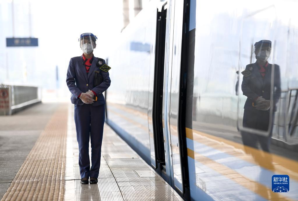 10月2日,中國鐵路西安局集團有限公司西安客運段列車(chē)長(cháng)王婷婷在銀川站站臺等候旅客乘車(chē)。