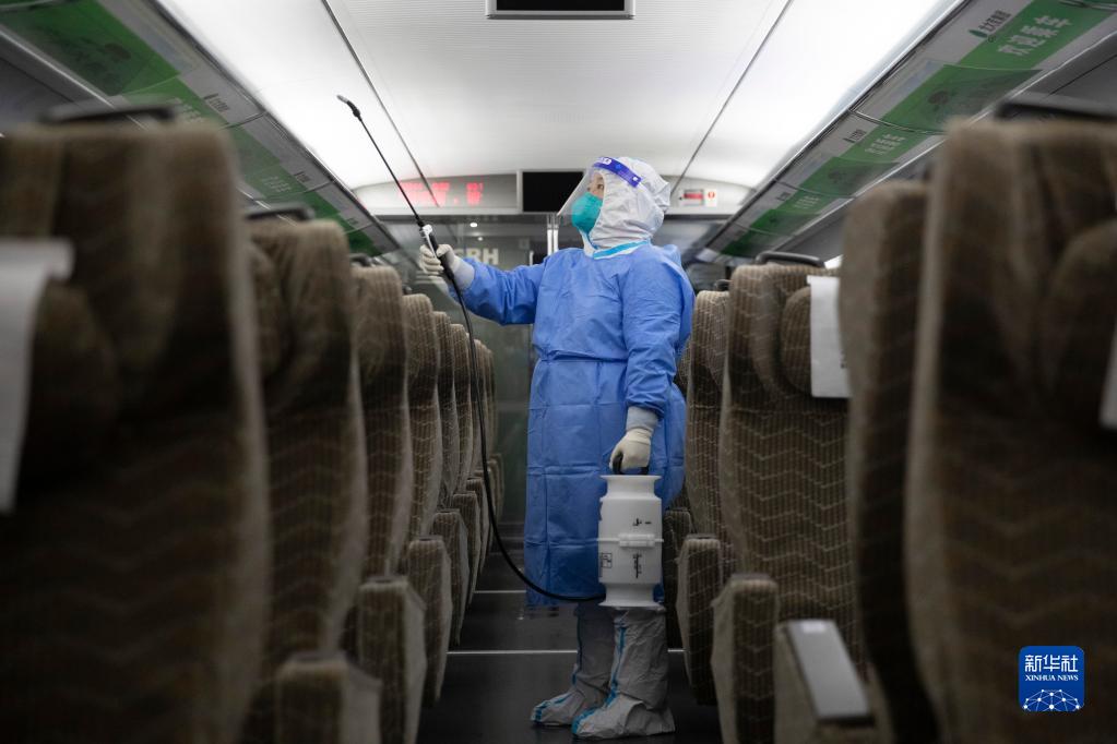 10月1日,在中國鐵路哈爾濱局集團有限公司哈爾濱動(dòng)車(chē)段檢修車(chē)間內,哈爾濱鐵路疾病預防控制中心的張強給動(dòng)車(chē)組車(chē)廂消殺。