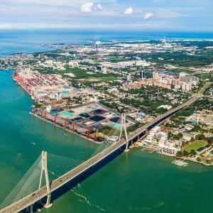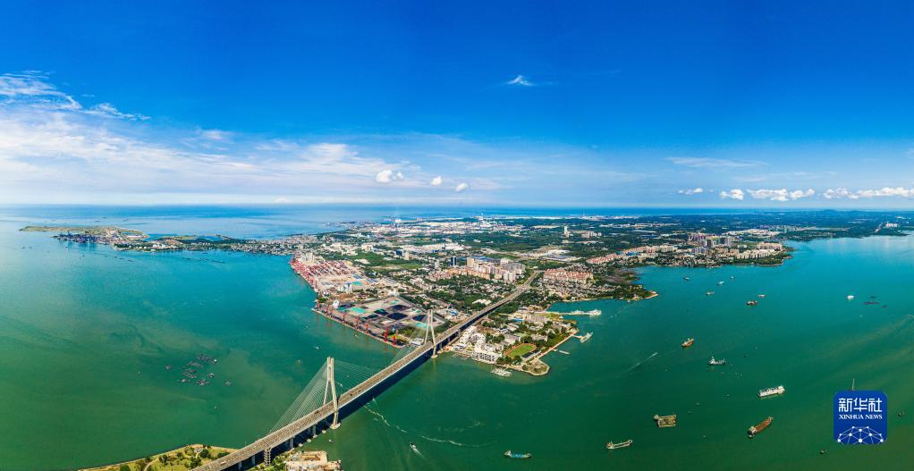 10月2日在海南儋州拍攝的洋浦大橋對岸的海南洋浦經(jīng)濟開(kāi)發(fā)區(無(wú)人機全景照片)。