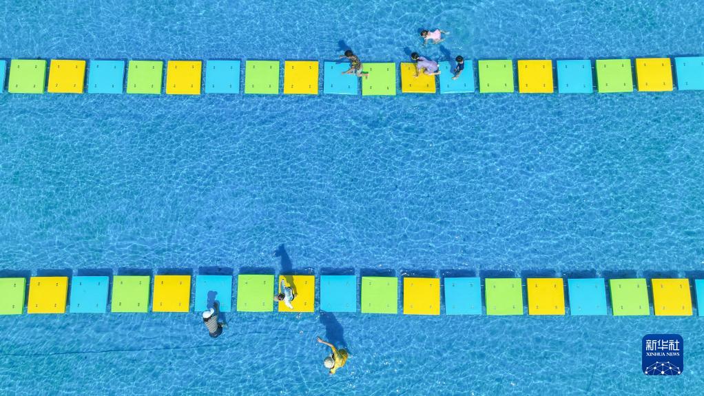 10月2日,游客在浙江省湖州市德清縣乾元鎮城北村礦坑泳池嬉戲(無(wú)人機照片)。