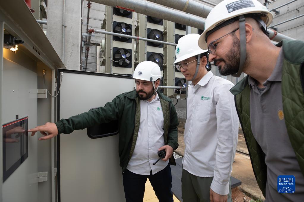 9月30日,在巴西里約熱內盧美麗山特高壓輸電二期項目里約換流站,國網(wǎng)巴控公司換流站運維主管許鴻飛(中)和巴方人員檢查設備運行狀態(tài)。新華社記者 王天聰 攝