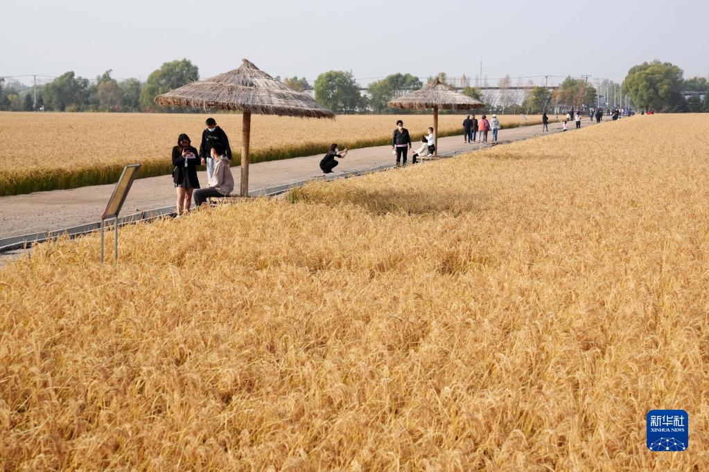 10月2日,人們在北大荒集團閆家崗農場(chǎng)有限公司農業(yè)現代化示范區的稻田旁游玩。