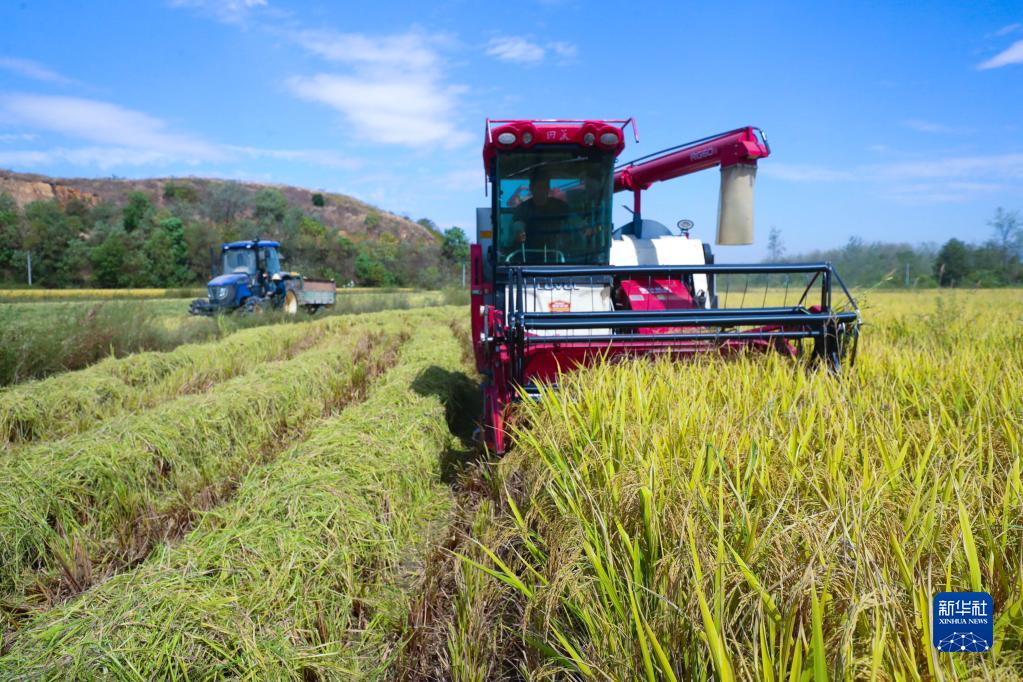 10月2日,河南省信陽(yáng)市光山縣南向店鄉何畈村鑫磊合作社社員在搶收水稻。