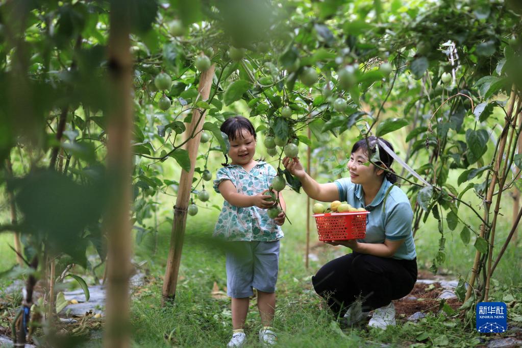 10月2日,游客帶著(zhù)孩子在貴州省榕江縣平江鎮巴魯村百香果園采摘百香果。