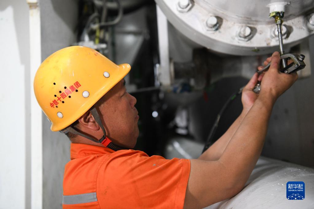 10月3日,工作人員在蕪湖城南過(guò)江隧道施工現場(chǎng)保養設備。