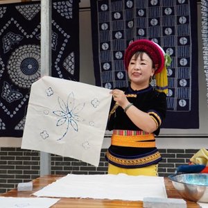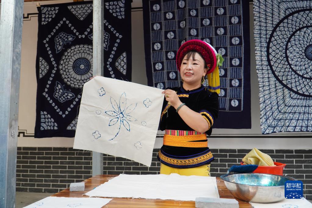 在湖南省桑植縣芙蓉橋白族鄉合群村,張丕和展示白族扎染技藝(9月8日攝)。